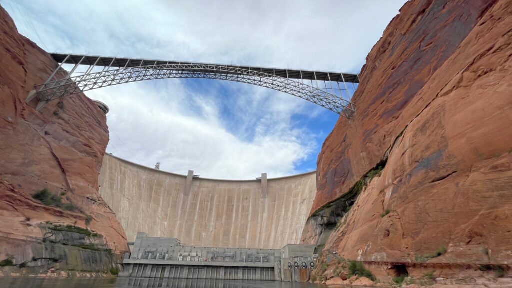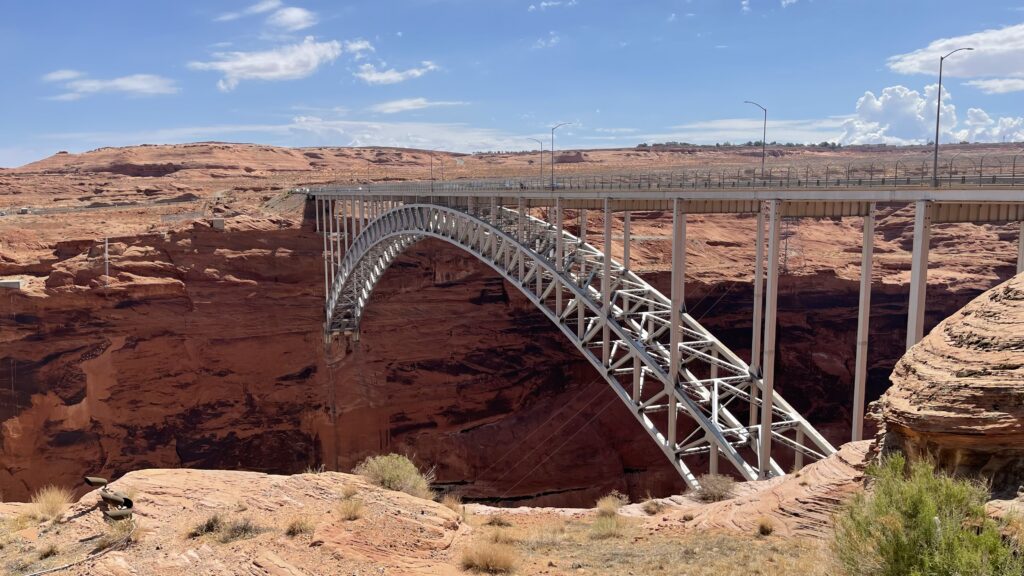 Der Glen Canon Dam ist ein gigantisches Bauwerk. Leider ist auch hier der Wasserstand sehr niedrig. Marc war 1992 das erste Mal in Page. Da war der Wasserstand im Gegensatz zu heute viel höher. Neben dem Staudamm steht diese Eisenbrücke, welche sämtlichen Verkehr über den Colorado leitet. In dieser Region gibt es nur diese Möglichkeit über den Colorado zu gelangen.