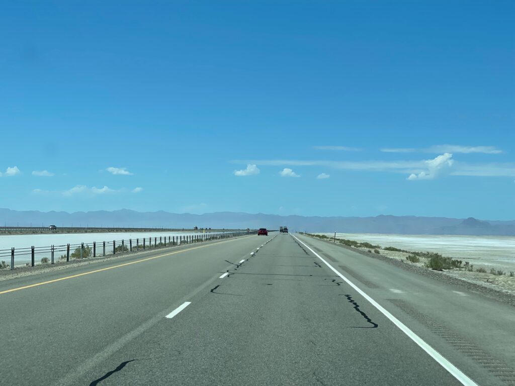 Am einen Tag fuhren wir über die I-80, den Salzseen entlang, bis nach Bonneville. Bis man dort ist, ist man ca. 1,5 Std unterwegs. Die Distanz von Salt Lake City bis zum Salt Flats Punkt in Bonneville beträgt ca. 180 km. Das letzte Drittel der Strecke ist schnurgerade. Da muss man schon achtgeben, dass man nicht einschläft – 60 km geradeaus, ein Wahnsinn😉